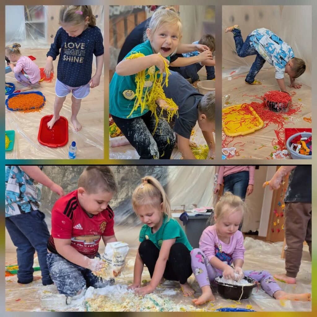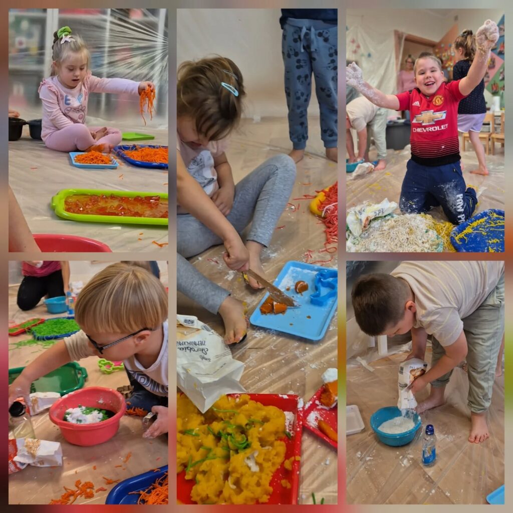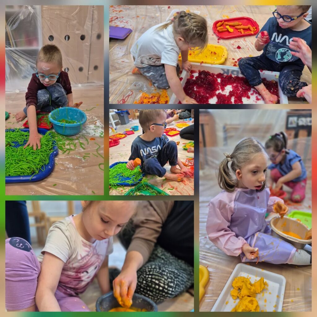 Sensoplastyka® to polisensoryczna, multikolorowa, wielozapachowa przestrzeń możliwości! Te zajęcia rozwojowe angażują wszystkie zmysły poprzez zabawy z różnorodnymi, bezpiecznymi materiałami sensorycznymi (produktami spożywczymi). Nie było tu przepisu na gotową masę sensoryczną – każdy miał swój sposób na wykorzystanie materiałów i swobodną przestrzeń do zabawy nimi.