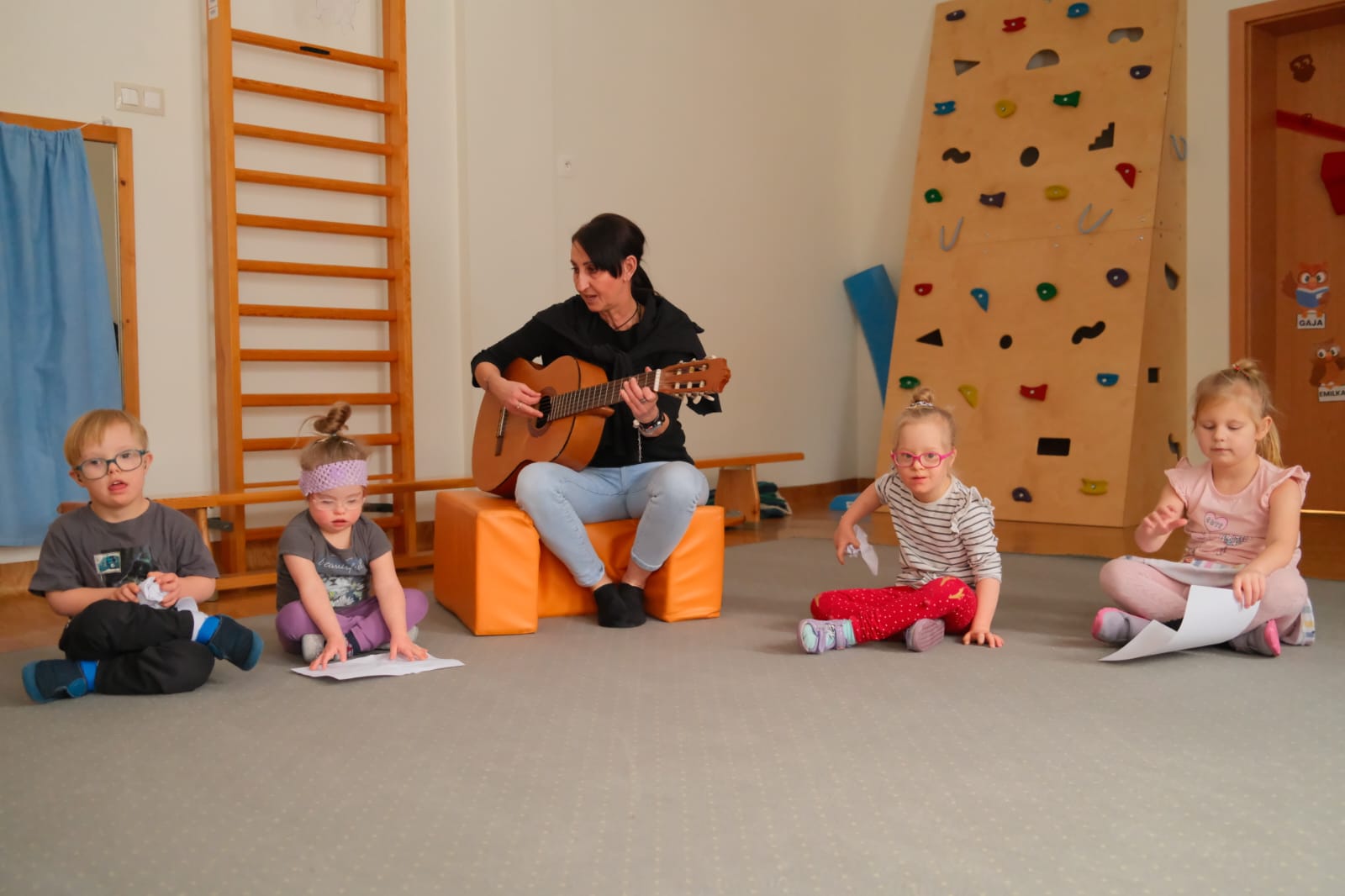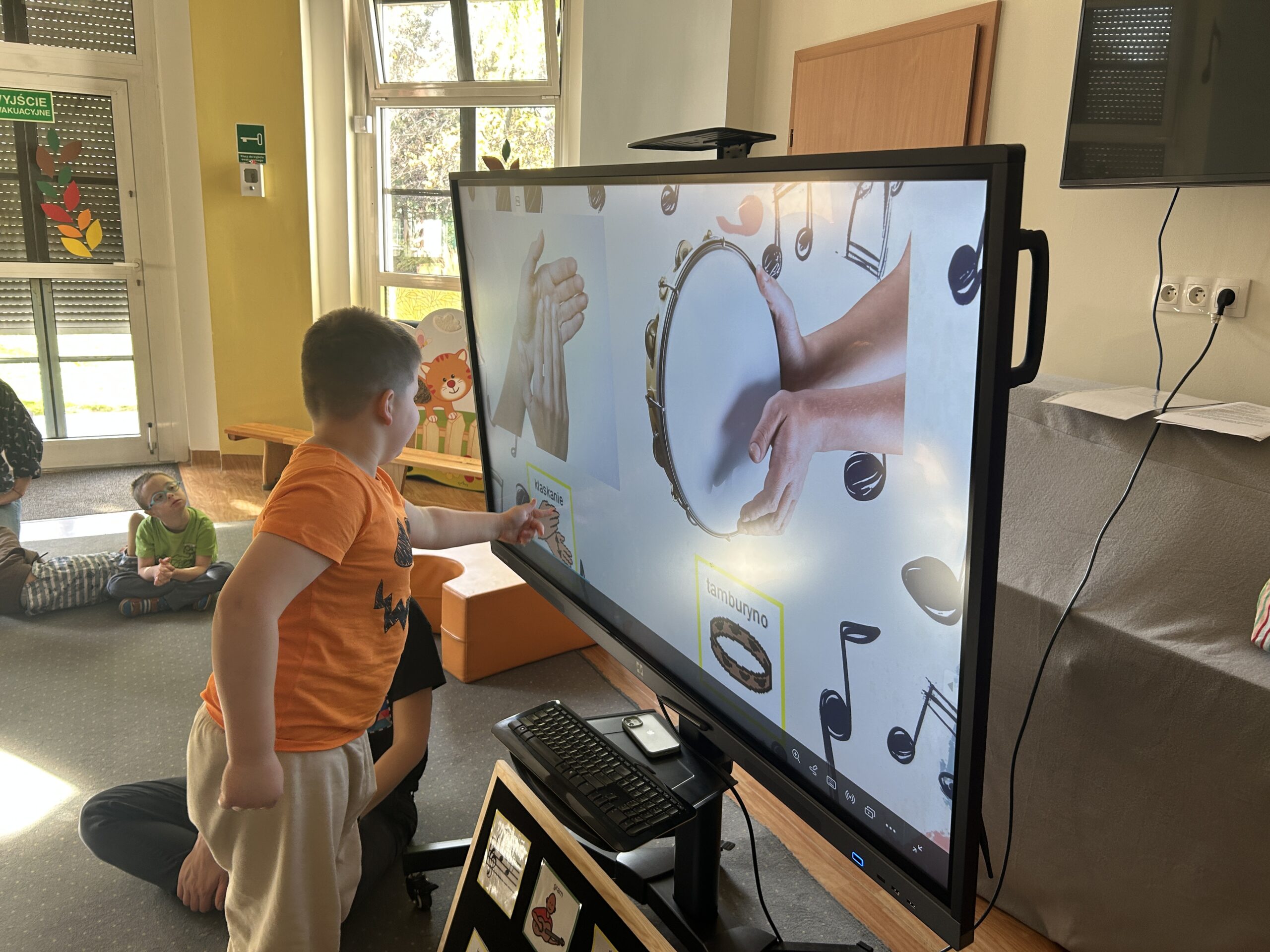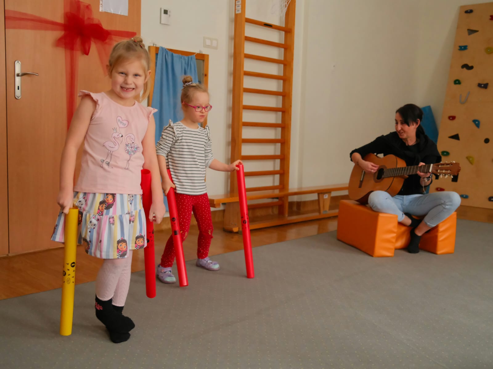 Raz w miesiącu spotykamy się na muzycznych zajęciach z panią Kamilą, panią Justyną i ich zaczarowanym Kotem Leonem. Podczas spotkań poznajemy proste, powtarzalne piosenki. Wykonujemy ćwiczenia, które pomagają rozwinąć umiejętności zarówno rytmiczne jak i melodyczne. Uczymy się współpracy w grupie, poprzez wspólny śpiew i zabawy integrujące grupę. Wszystko to odbywa się w radosnej atmosferze zabawy, która jest podstawą do nauki muzyki. Dzieci uczą się piosenek dostosowanych do ich wieku, tematyka związana jest z porami roku, uroczystościami czy codziennym życiem dziecięcym.