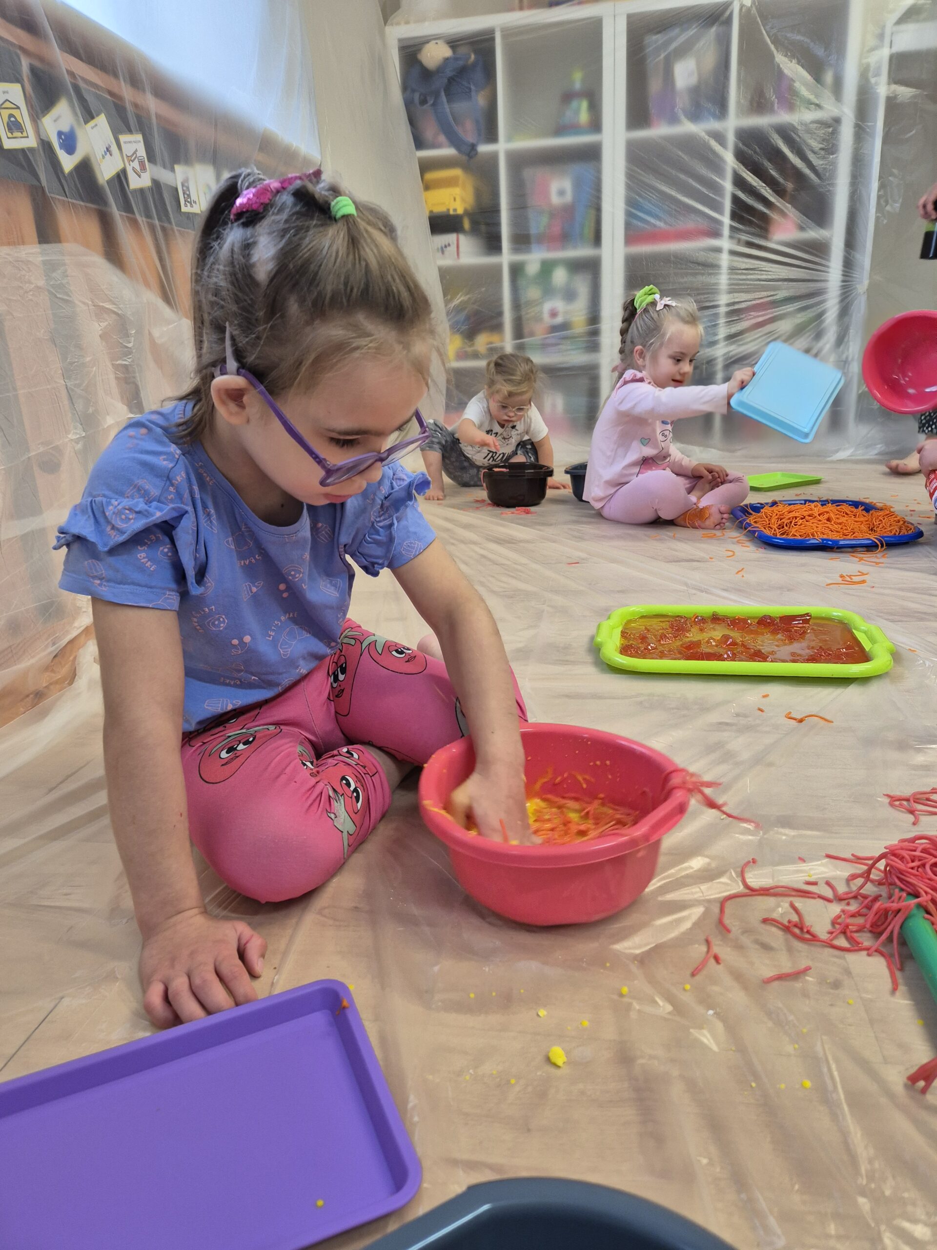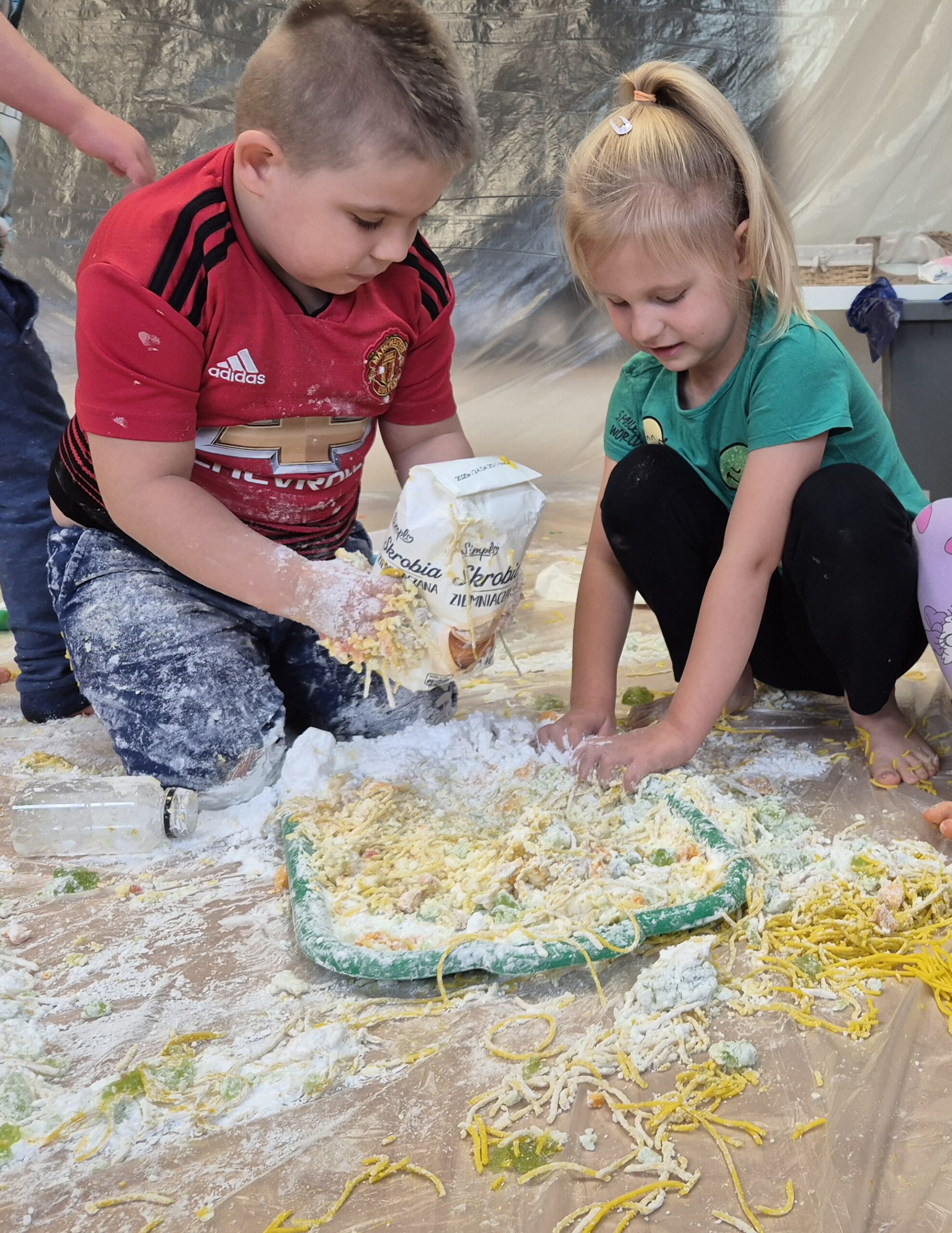 Zajęcia odbywają się w większej grupie. Nie używamy gotowych przepisów na masy plastyczne, ale stwarzamy warunki do samodzielnego działania, dając dzieciom czas i przestrzeń do eksplorowania i swobodnej zabawy. Pracujemy na dużej przestrzeni (wolna, zabezpieczona sala bez stołów i krzeseł), zapewniając tym samym swobodę w wyborze pozycji do pracy i swobodę poruszania się. Eliminujemy dystraktory t.j. fartuchy, odzież ochronną, a także polecenia – umożliwiamy dzieciom wykorzystanie ich wyobraźni oraz potencjału zabawy.  Zajęcia realizowane są przez certyfikowanych trenerów zajęć Sensoplastyka ®